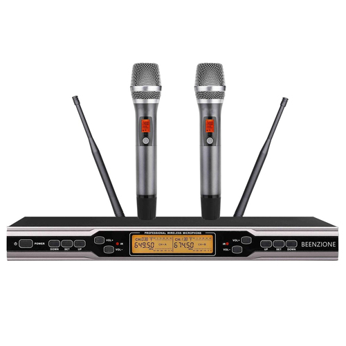一拖二U段無線紅外對頻無線麥克風,200個頻率通道(左右各100個可選 )。